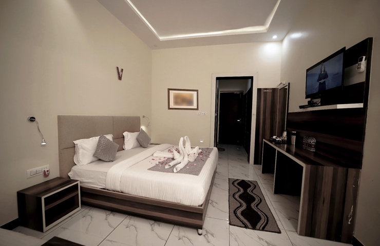Premium : A spacious room with modern amenities such as a smart TV, fast WiFi and an attached bathroom, designed for a comfortable stay.